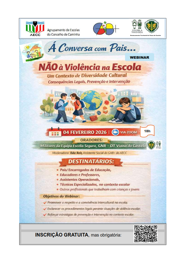 No âmbito do Projeto Educar para o Sucesso Escolar, o Gabinete de Apoio ao Aluno e à Família (GAB+) /Serviço Social do Agrupamento de Escolas do Concelho de Caminha em colaboração com a Equipa da Escola Segura, GNR – DT de Viana do Castelo, no dia 04/02/2026, às 18h00 (Via ZOOM, promove mais uma sessão do Ciclo “À Conversa com Pais…”, dedicada a uma temática de elevada relevância no atual contexto educativo e social:
